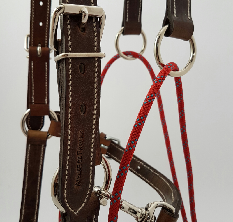 Le mousqueton de la longe est fixée directement sur la corde de muserolle ce qui offre le gros avantage de ne pas avoir à enlever la longe lors du changement de main.