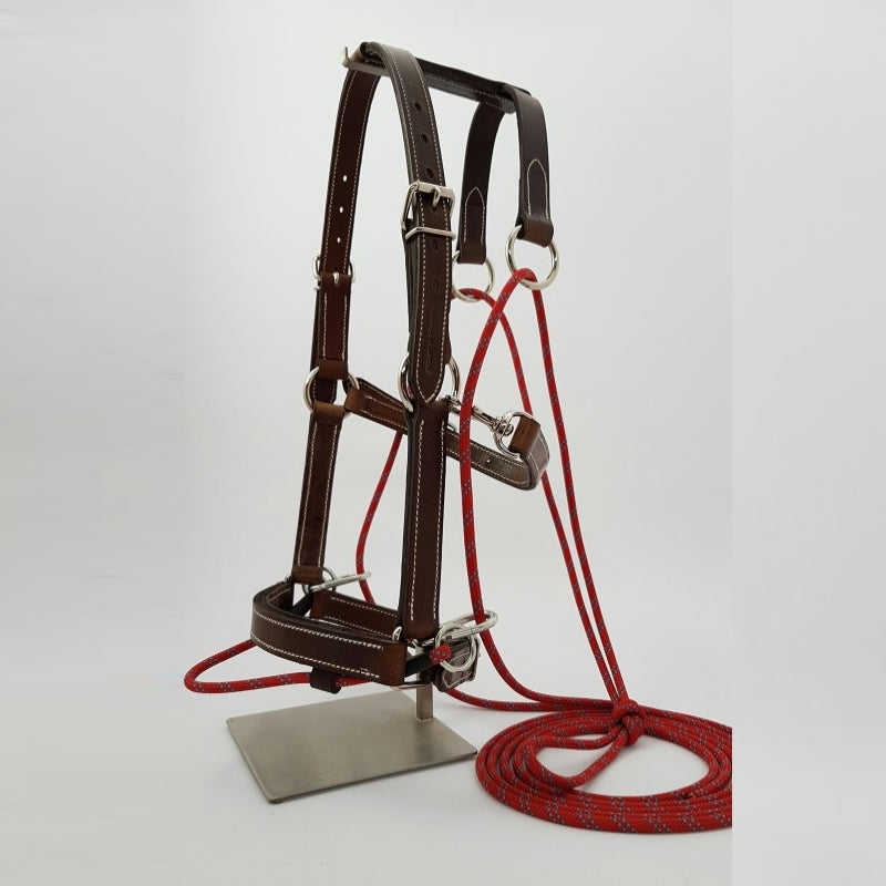 Conçu sur la base d’un licol en cuir extrêmement résistant, il se place très facilement sur la tête du cheval. Les cordes s’attachent entre les pattes du cheval sur le mousqueton de la sangle, passent sur une têtière déportée vers l’arrière de la nuque pour augmenter l’action d’abaissement de l’encolure et se fixent de manière latérale à la sangle.